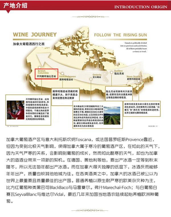 冰酒有着悠久的历史,它的酿造是于200年前在欧洲无意间被发现后开始流传至今。当时德国的葡萄园遭受突然来袭的霜害,为了挽救损失,酿酒师将冰冻的葡萄压榨后按传统的方法发酵酿酒,惊讶地发现结果是酸甜比例平衡,甘如蜂蜜般的美酒,而将之命名为冰酒。冰酒酿造技术由德国移民带入加拿大,经当地人进一步改良,酿出的酒更独特,更醇香。其品种主要有冰白葡萄酒和冰红葡萄酒。其中冰白葡萄酒颜色呈透明金黄色,素有"液体黄金"之美称;散发出蜂蜜和水果等香味;口感甘甜醇厚,清新可口,是重视健康之人士的绿色食品。最佳的饮用温度为冷藏至4~8℃。